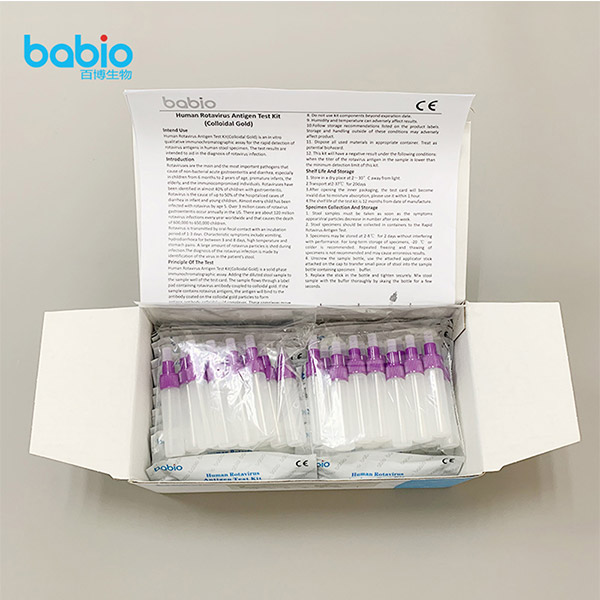 மனித ரோட்டா வைரஸ் ஆன்டிஜென் டெஸ்ட் கிட் (கோலாய்டல் கோல்ட்) என்பது மனித மல மாதிரியில் ரோட்டா வைரஸ் ஆன்டிஜென்களை விரைவாகக் கண்டறிவதற்கான ஒரு இன் விட்ரோ குவாலிட்டிவ் இம்யூனோக்ரோமாடோகிராஃபிக் மதிப்பீடாகும். சோதனை முடிவுகள் ரோட்டா வைரஸ் நோய்த்தொற்றைக் கண்டறிய உதவும்.